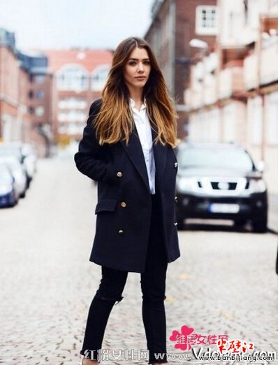搭配要点:白色条纹圆领T恤+深蓝色牛仔吊带裤+黑色长款呢大衣+白色波点雪地靴+酒红色手提包